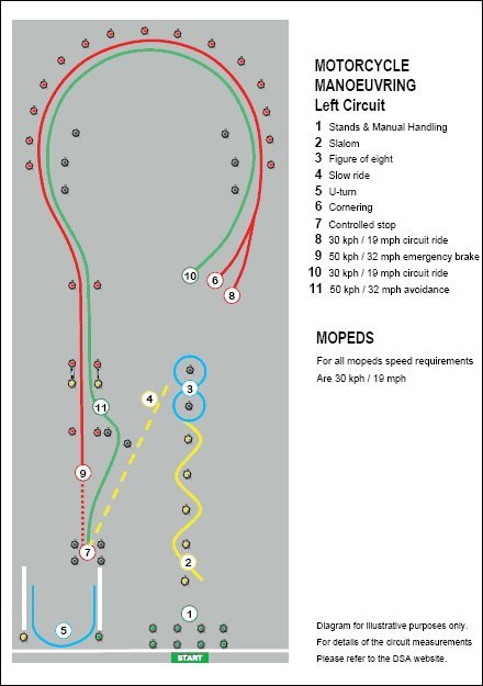 Module 1 is an off road test riding around cones, either a left hand or right hand circuit at a MPTC.